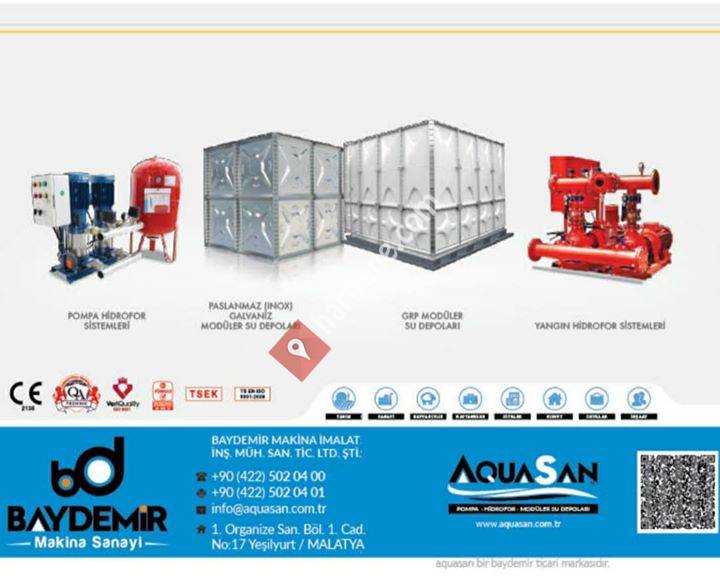 "AQUASAN; 2008 yılından bu yana modüler su deposu, hidrofor ve pompa sistemleri alanlarında bölgenin önde gelen imalatçı ve tedarikçi çözüm ortağıdır. Günümüzde, kendisine ait üretim alanında büyük ölçeklerde su deposu, hidrofor ve pompa sist. üretimini yapmakta olup üstlendiği bir çok projeyi montaj dahil anahtar teslimi olarak tamamlamıştır.AQUASAN, kuruluşundan bu yana her geçen gün artan memnun müşteri sayısına ve potansiyeline ulaşmış; Türkiye'de su depolama ve transferi alanında güçlü ve istikrarlı bir ilerleme kaydetmiştir. Bir çok kamu ve özel projede markamızı taşıyan ürünler şu anda kullanımdadır."