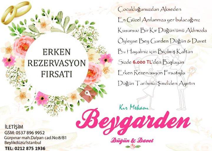 "Bey Garden Düğün Davet Organizasyon-Bey Garden davet mekanı 500 kişilik kır düğünü alanına sahiptir.-Bahar ve yaz dönemlerinde kır bahçesi 3 mevsim hizmet verilmektedir.-Kurumsal şirket yemekleri, bayi toplantıları, düğün nişan sünnet kına organizasyonları odaklı hizmet vermektedir.200 300 400 500 600 kişilik yemekli, kokteyl ya da Ordövr menü ile her türlü hizmeti sunabilmektedir.-Tesisimiz, her gün sadece, tek düğün ayrıcalığı ile hizmet vermektedir.-Otopark sorunsuzluğu-Metrobüs yakınlığı ile-Şehrin merkezinde lokasyon avantajı ile doğru tercih olmaya devam etmekteyiz.- Müessesemiz kesinlikle ALKOLSÜZDÜR."