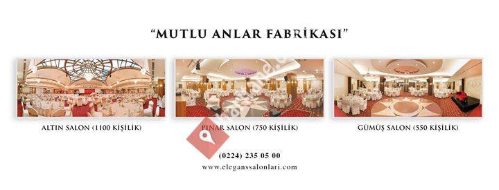 Bursa’nın kalbi Osmangazi'de, tüm beklentiler göz önüne alınarak hazırlanan Elegans Salonları, alanında “Güney Marmara’nın en büyüğü...” Düğün, nişan, kına, sünnet, kokteyl ve şirket toplantıları için üç farklı salonumuz bulunuyor. Özel teraslı 1100 kişilik Altın Salon, 750 kişilik Pınar Salon ve 550 kişilik Gümüş Salon... 220 araçlık kapalı otoparkı, karşılama, vestiyer, gelin-damat odaları, mescitler, merkezi sistem ısıtma ve soğutma, havalandırma, çocuk oyun odaları, profesyonel ses ve ışık sistemleri ve kamera çekimleri ise hizmetlerimiz...