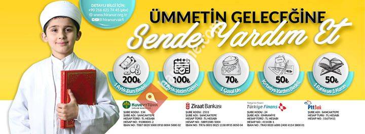 Hiranur Vakfımız; ihtiyaç sahiplerine gıda, kumanya, giysi vb. yardımlarda bulunarak kuran kurslarına ve ihtiyaç sahibi ailelere günlük iki öğün sıcak yemek ve ekmek ihtiyaçlarını karşılamaktadır.