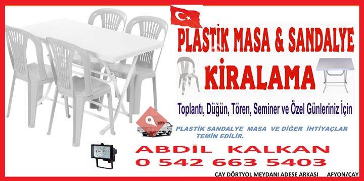Toplantı ve her türlü organizasyonlarınızda kollu, kolsuz plastik sandalye masa ve diger dügün manzemeleri kiralama hizmetinizdeyiz 05426635403