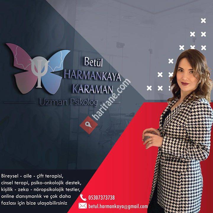 Uzman Psikolog Betül Harmankaya Karaman. Bireysel - aile - çift terapisi, cinsel terapi, psiko-onkolojik destek, kişilik - zeka - nöropsikolojik testler, online danışmanlık ve çok daha fazlası için bize ulaşabilirsiniz..
